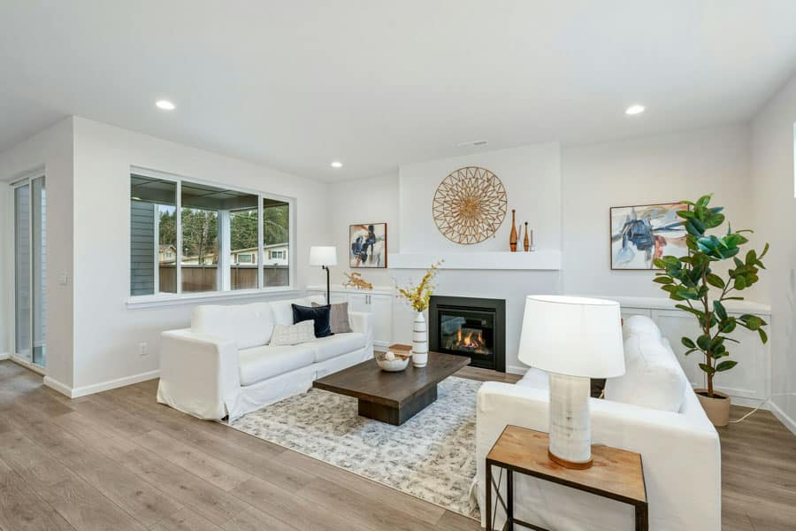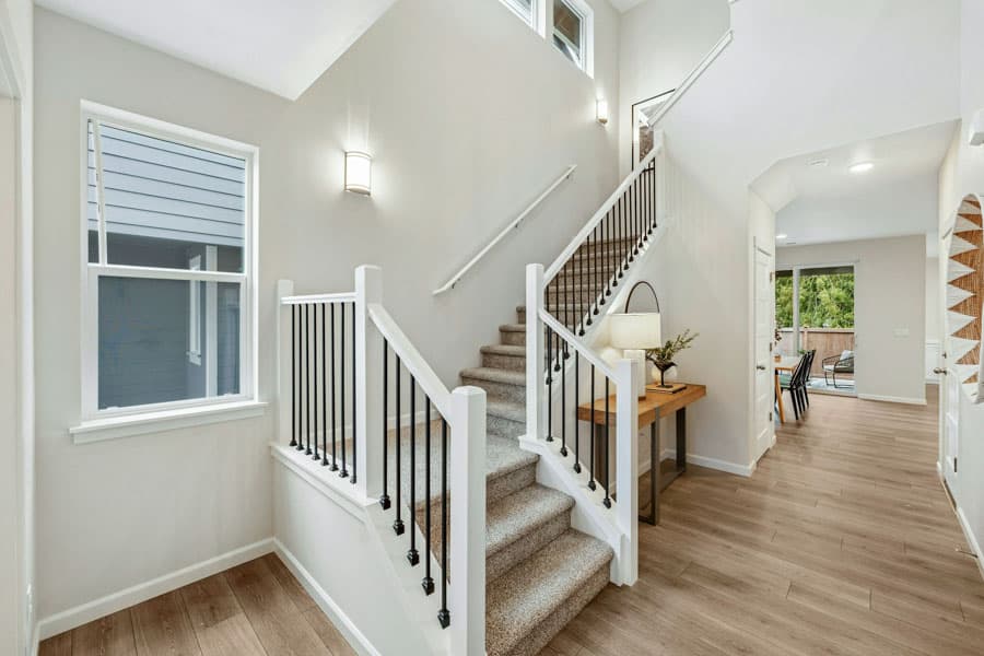 The Lark is a home with 4 bedrooms, 3 bathrooms and 2-car garage. Features include covered patio, dining room, family room, fireplace, primary bed upstairs and walk-in closets.